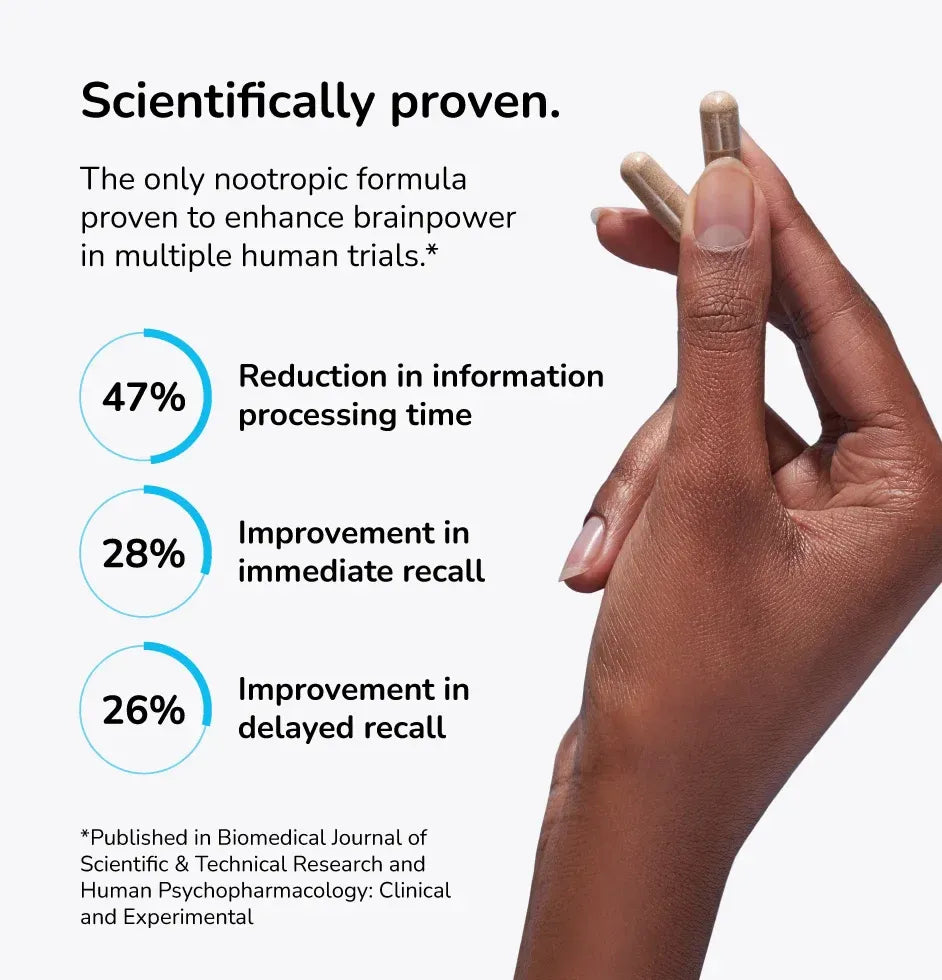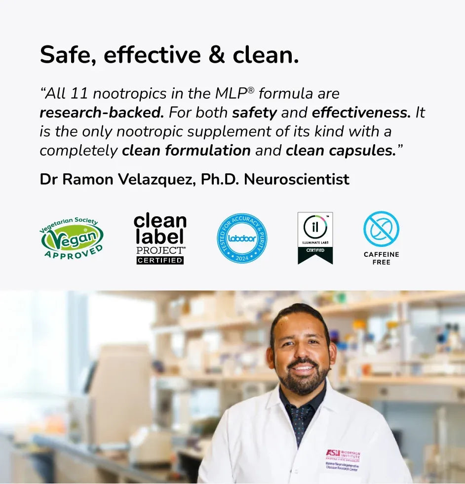 MLP®is theonlynootropic formula proven to enhance brainpower in multipledouble-blind, placebo-controlled human trials1,2,3, with results published in peer-reviewed academic journals.